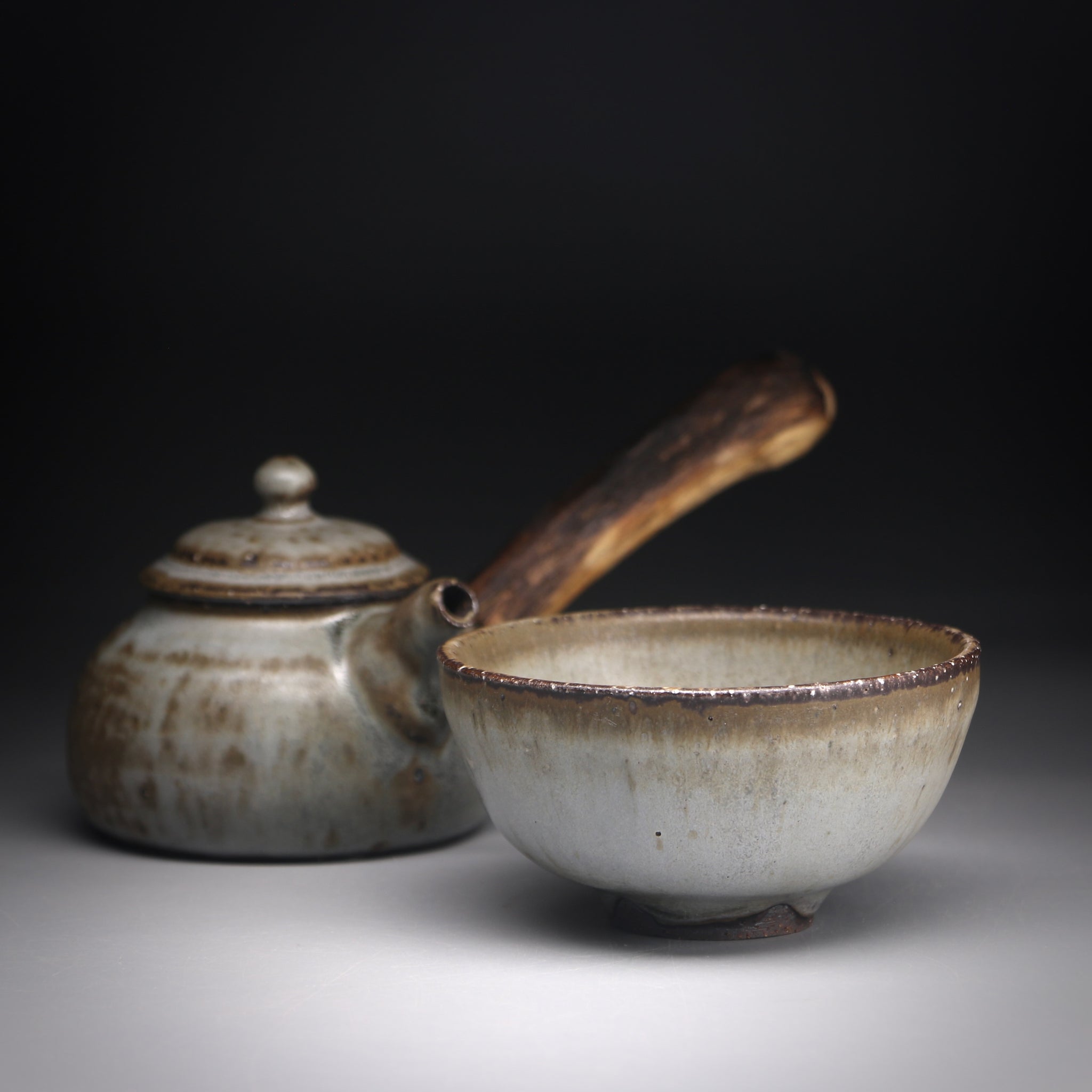 Handcrafted with a stone-like finish and complemented by a smooth wooden handle, the pieces feel both earthy and inviting. Ash-kissed textures and muted elegant hues recall a winter hearth — a quiet refuge where the world softens and the tea drinker returns to themselves.